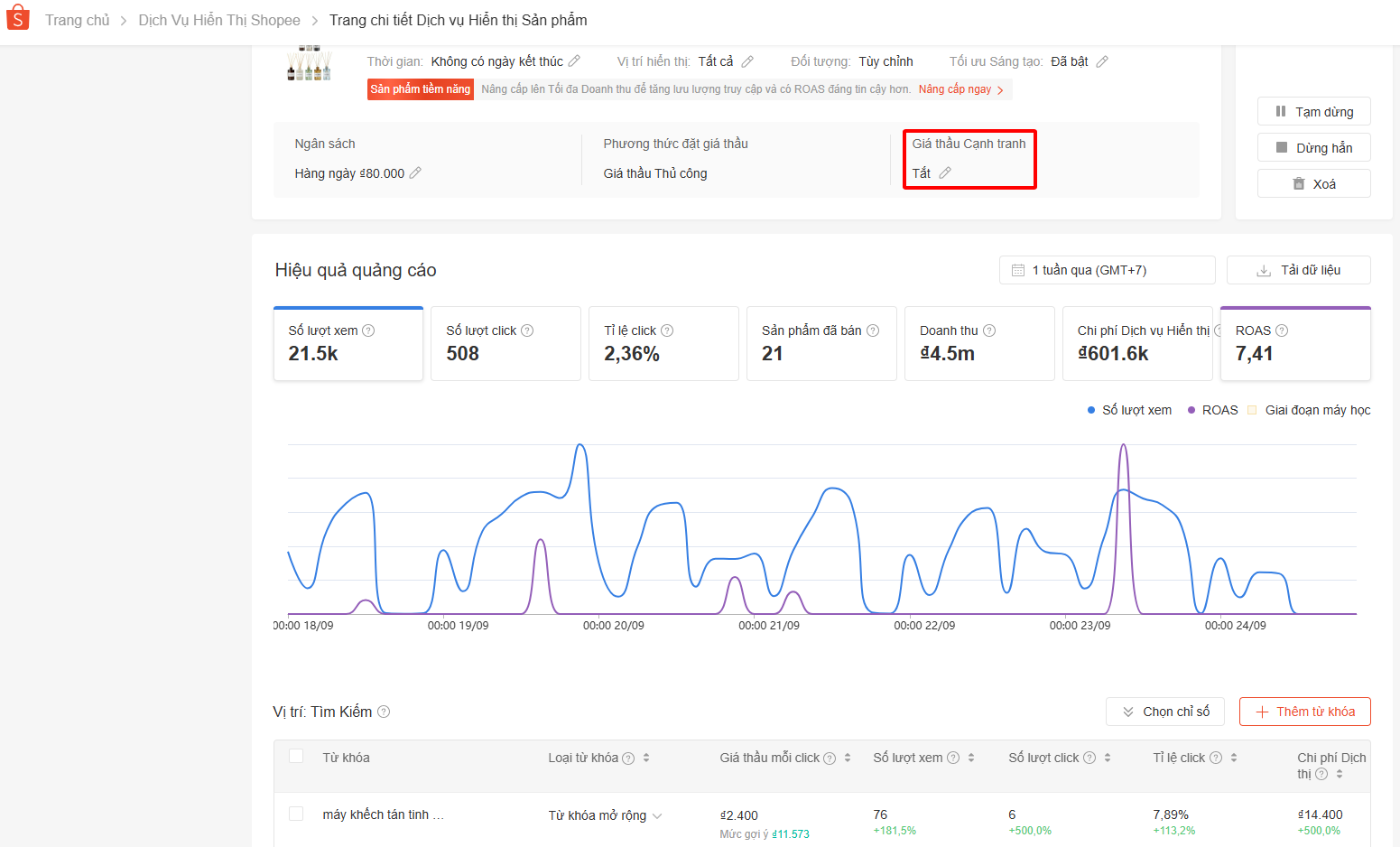 3.b Tính năng Giá thầu Cạnh tranh tại trang Chi tiết chiến dịch trên giao diện ứng dụng Shopee
