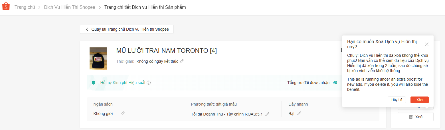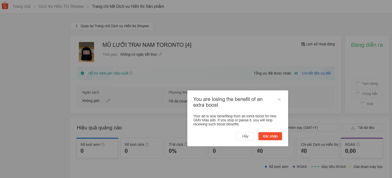 - Thông báo sẽ xuất hiện khi người bán cố gắng tạm dừng hoặc dừng chiến dịch được áp dụng tính năng.