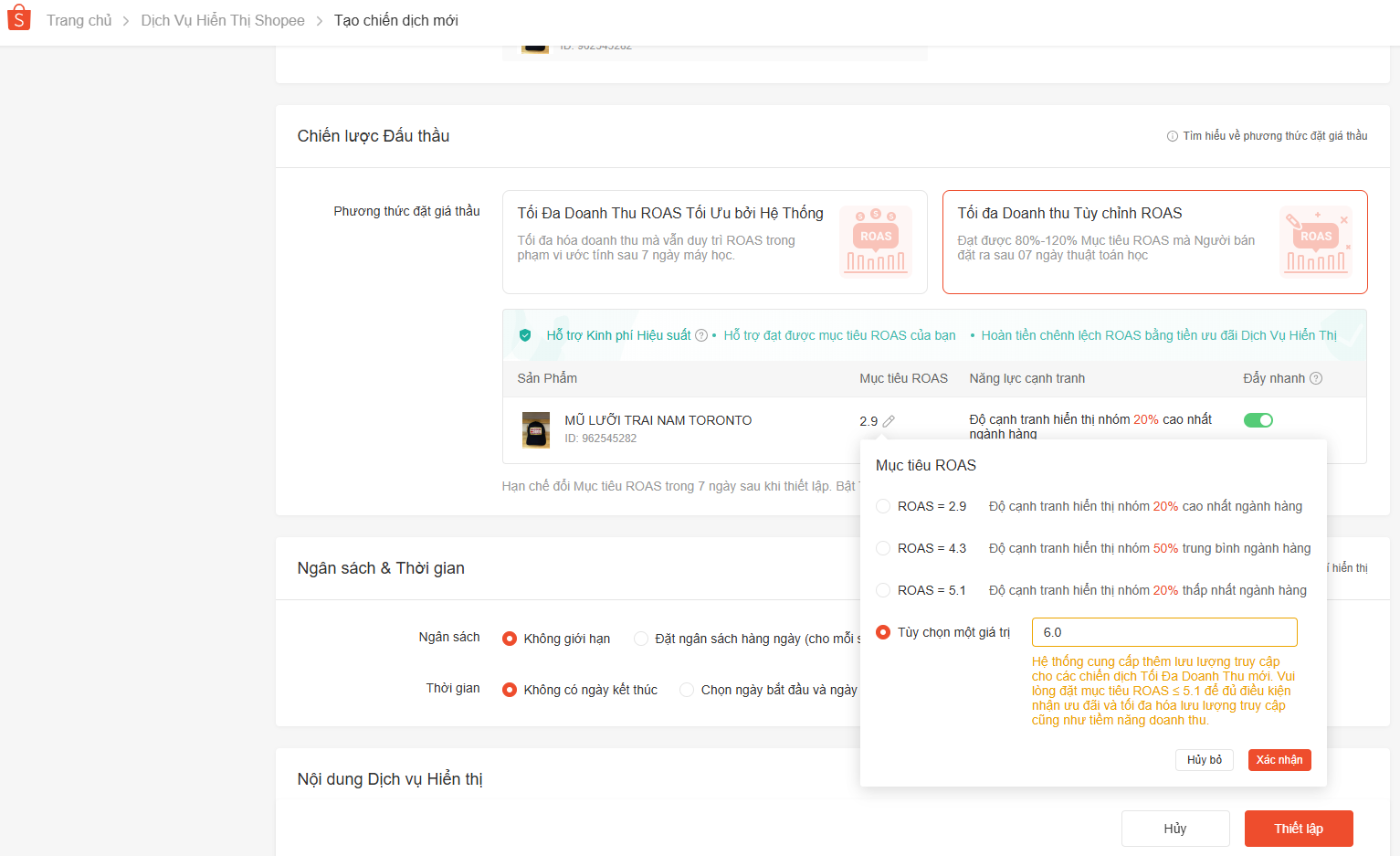 - Đối với Tối Đa Doanh Thu - Tùy chỉnh ROAS, tính năng chỉ hiệu quả khi người bán đặt Mục tiêu ROAS ≤ mức ROAS cao nhất đề xuất bởi hệ thống.