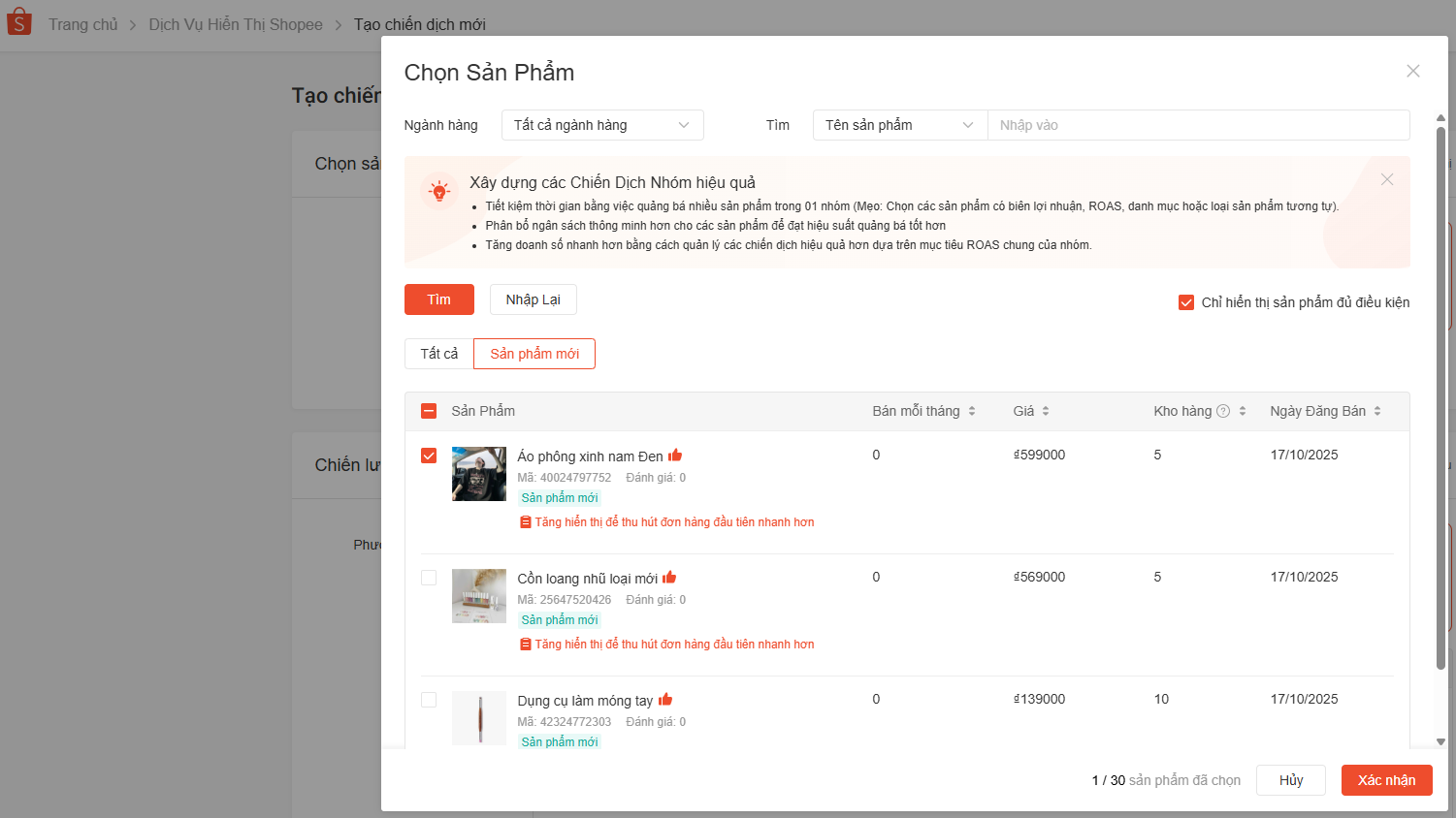 - Dành cho sản phẩm được quảng bá bằng Tối Đa Doanh Thu lần đầu trong 60 ngày gần nhất và không có nhãn ‘Sản phẩm mới’ tại trang Dịch Vụ Hiển Thị Shopee khi tạo chiến dịch mới.