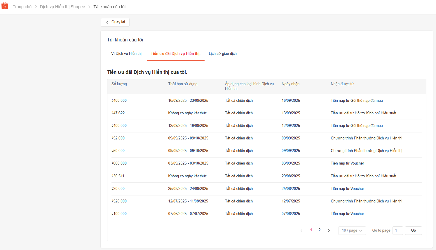 Bạn có thể truy cập Dịch Vụ Hiển Thị Shopee > Tài khoản của tôi để kiểm tra lịch sử dùng tiền ưu đãi Dịch Vụ Hiển Thị và loại hình tiêu dùng sẽ được gắn tương ứng với số tiền đã chi trả.