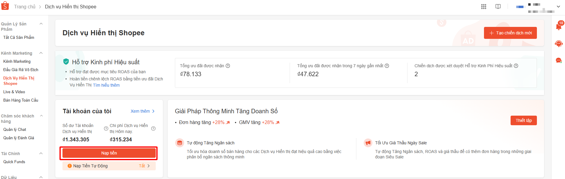 1. Đăng nhập vào Kênh Người Bán trên trình duyệt web và bấm vào mục“Dịch Vụ Hiển Thị Shopee”. Ở trang này, bạn sẽ thấy được số dư Tài khoản Dịch Vụ Hiển Thị của mình cũng như nạp tiền bằng cách nhấn vào ô“Nạp tiền".