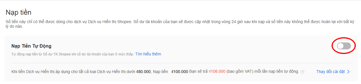 Nạp tiền tự động cho phép tự động cấn trừ số dư tại Ví Shopee vào Tài khoản Dịch Vụ Hiển Thị khi Số dư tài khoản thấp.