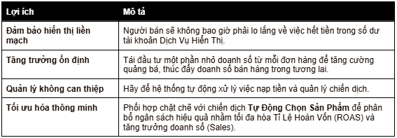 Nạp Tiền Tự Động (Tài khoản ký quỹ) đảm bảo chiến dịch của người bán luôn còn tiền trong số dư Dịch Vụ Hiển Thị, cho phép phân phối liên tục và ngăn ngừa việc tạm dừng chiến dịch. Kết hợp với chiến dịch Tự Động Chọn Sản Phẩm, nó giúp cải thiện ROAS và Doanh số.