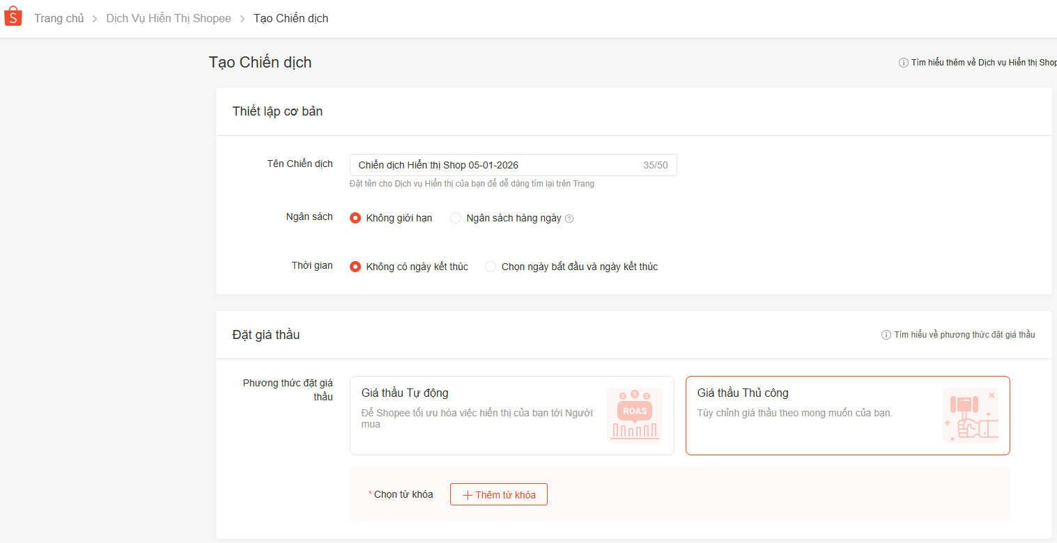 Khi tạo Dịch vụ Hiển thị Shop, bạn có thể chọn chọn giá thầu tự động trong phần Phương thức đặt giá thầu. Với tính năng giá thầu tự động, Shopee sẽ giúp bạn đặt giá thầu cho từ khóa một cách tự động.